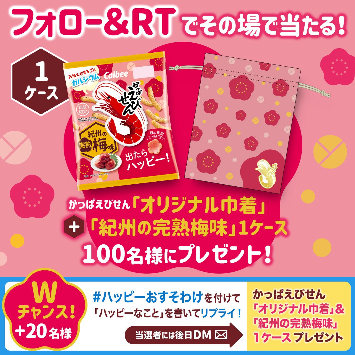 ●「かっぱえびせん」公式Twitterアカウント(@CalbeeKappaCP)をフォローし、キャンペーン投稿をリツイートした方の中から、抽選で100名様に『かっぱえびせん 紀州の完熟梅味』(12袋)と梅柄のオリジナル巾着をプレゼントします。また、Wチャンスとして「#ハッピーおすそわけ」を付けて「ハッピーなこと」を書いてリプライした方の中から抽選で20名様に同賞品をプレゼントします。