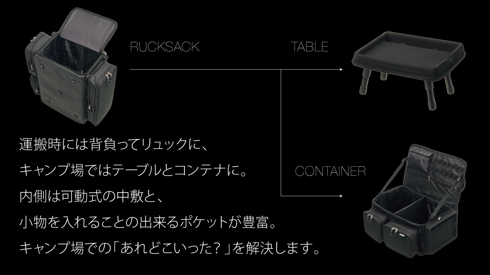 本アイテムは、テーブルとコンテナに早替わりするリュックです。運搬時には背負ってリュックに、キャンプ場ではテーブルやコンテナとして活躍します。