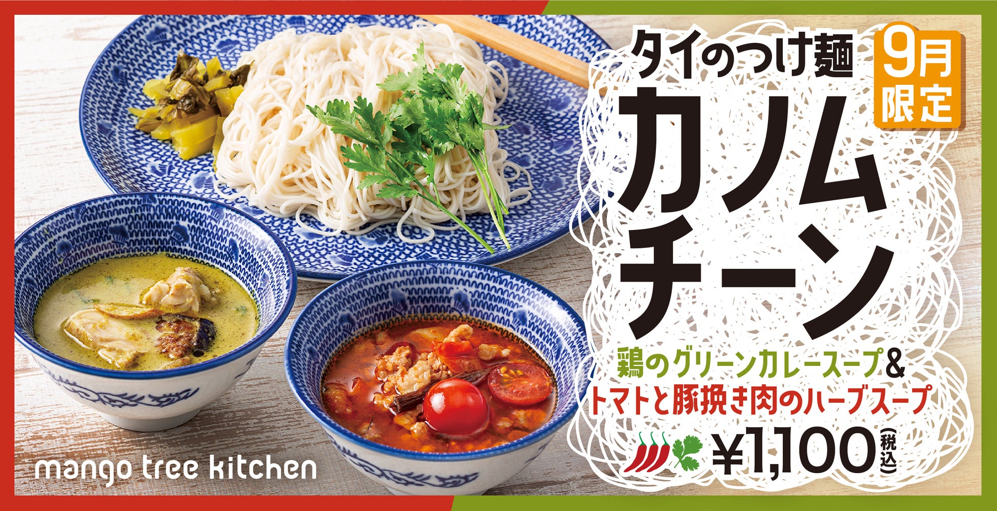 日本のそうめんに似た、米粉を発酵させた細麺”カノムチーン”は、地域によって味付けの異なるスープをかけて食べるのがポピュラー、まだまだ暑さの厳しい9月、夏バテで疲れた体に効くカレーと食べやすいそうめんでさっぱりとお召し上がりいただけます。