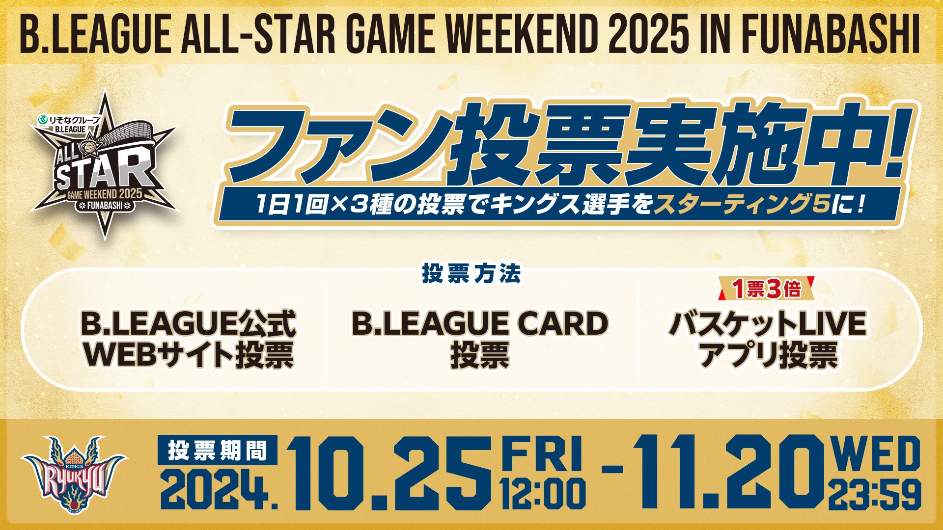 今回も例年同様に「B.BLACK」と「B.WHITE」の2チームに分かれ開催され、琉球ゴールデンキングスの選手は、「B.WHITE」にエントリーします。また、ALL STARへの出場選手は以下の方法にて選出され、本日10月25日(金)12時より両チームのスターティング5を決める「ファン投票」が開始します。