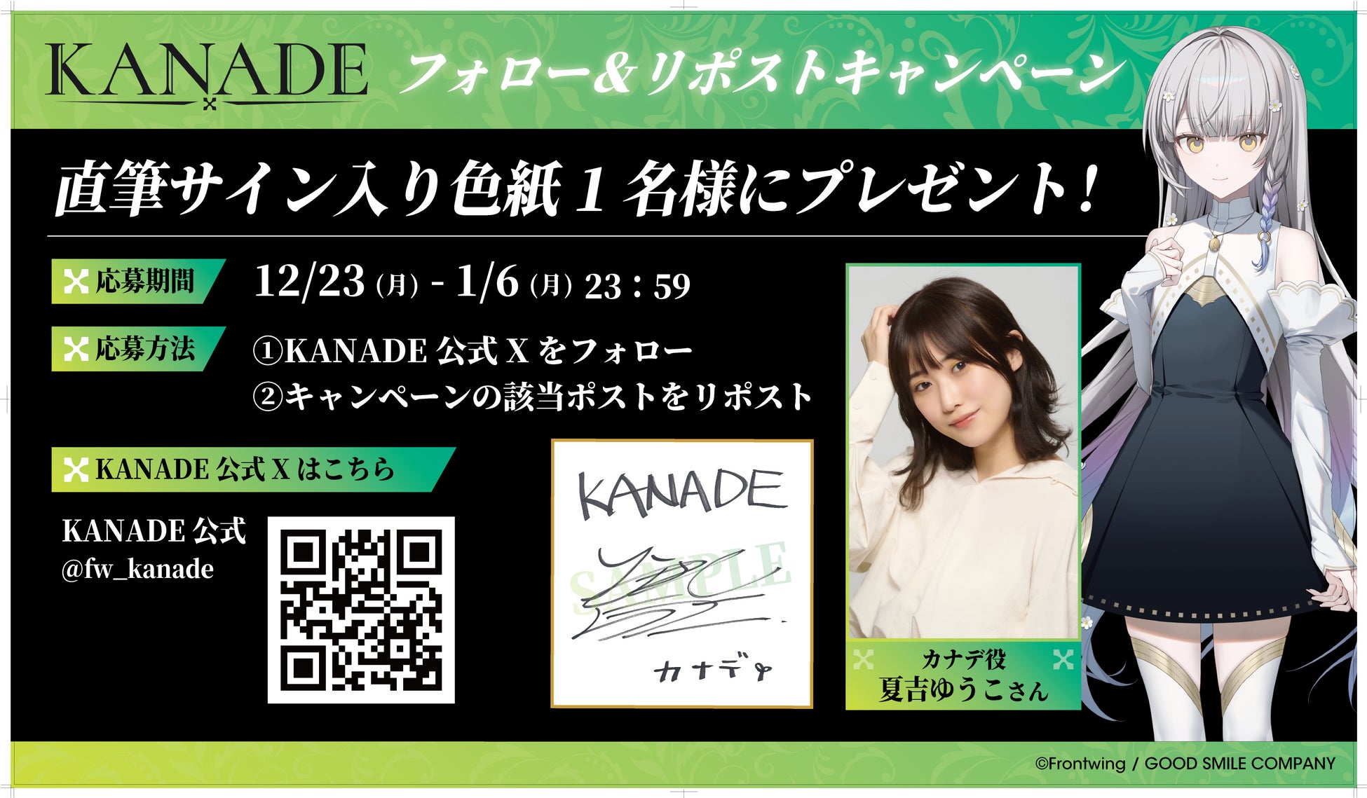 『KANADE』 公式X(https://x.com/fw_kanade)にて、カナデ役 夏吉ゆうこの直筆サイン色紙が当たるフォロー&リポストキャンペーンが開催中です。奮ってご応募ください。