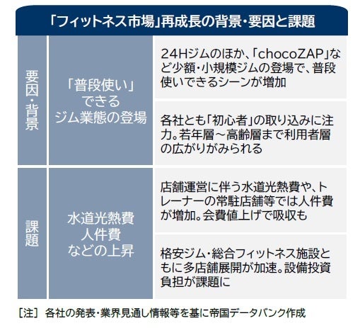 フィットネス市場は、コロナ禍の影響で度重なる営業時間短縮や休業に直面し、会費免除や休退会者の増加を余儀なくされ、市場規模は大きく減少した。一方、在宅勤務などの長期化で健康を意識した動きも広がり、フィットネスやジムの利用者は回復傾向にある。1週間当たりの滞在時間が短く、「タイパ」に代表される価格帯に敏感な若年層を取り込んだ、月額3千円前後の割安なフィットネス業態の成長が、業界全体の市場拡大をけん引した。トレーニングやエステに特化し、運動初心者や女性をターゲットにしたパーソナルジム業態など、新たな利用者層を取り込んだ業態の拡大が進んだことも、アフターコロナ下で目立つ特徴的な動きだった。