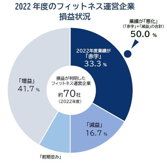 損益ベースでは各社で二極化が鮮明となった。2022年度の損益が判明した約70社の実績ベースでは「増益」が41.7%を占めた一方、「赤字」「減益」など業績が悪化した割合も計5割を占め、傾向が分かれた。赤字となった企業では、店舗運営に必要な電気代の高騰に加え、プール運営では水道代の上昇、トレーナーなどが常駐する店舗では人件費の上昇も響いた。会員費の値上げによる対応が多かったものの、コストアップ分を吸収できなかった企業が目立ったほか、月額料金が安価な格安ジムの台頭などで顧客獲得競争が激化し、収益力が低下したことも要因となった。