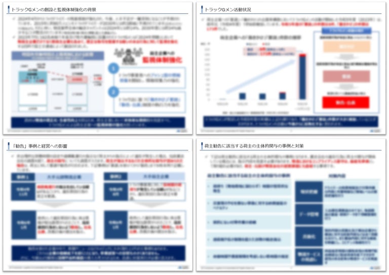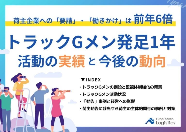 日本最大級の物流コンサルティングファーム 船井総研ロジ株式会社(本社:大阪市中央区、代表:橋本直行、以下「船井総研ロジ」)は、発足から1年が経ったトラックGメンのこれまでの活動実績と、「勧告」事例と経営への影響、荷主勧告に該当する荷主の主体的関与の事例と対策について解説した最新資料「トラックGメン発足1年。活動の実績と今後の動向」を公開しました。