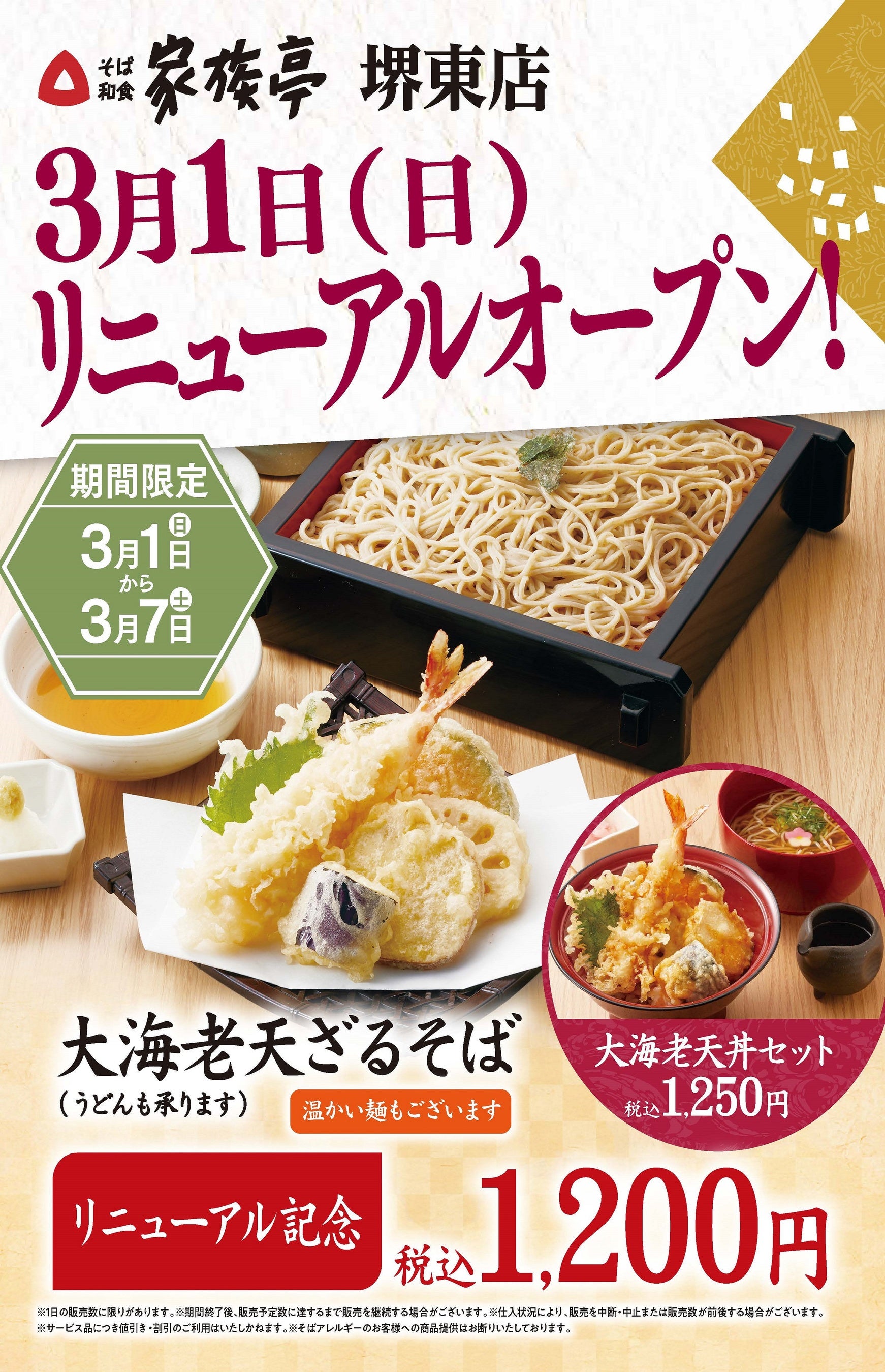 株式会社家族亭(本社:大阪府大阪市、代表取締役執行役員社長:坪山憲司)が運営するそば和食チェーン「家族亭」は、「家族亭 堺東店」を2026年3月1日(日)午前11時にリニューアルオープンいたします。
