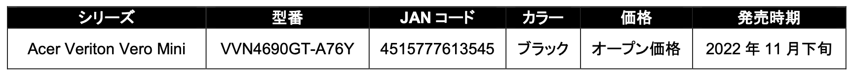 Acer Veriton Vero Miniシリーズの新製品「VVN4690GT-A76Y」は、動画編集など負荷のかかる作業もスムーズに行える第12世代インテル(R) Core(TM) i7プロセッサーを搭載。さらにストレージは大容量の512GB SSDを搭載しています。OSはWindows 11 Pro。用途に合わせてMicrosoft Office Home & Business 2021、またはMicrosoft Office Personal 2021のプリインストールモデルからお選びいただけます。