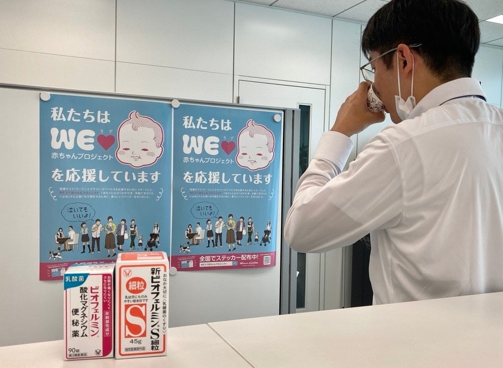 ビオフェルミン製薬株式会社内でのポスター掲示や社員へのステッカー配布を通し、「赤ちゃんの泣き声を温かく見守っている人がいる」ということを可視化。同社はCSR活動の一環として子育てしやすい社会づくりへの貢献を目指して、子育て世代を応援する取り組みを開始します。