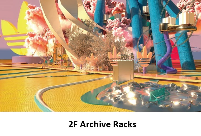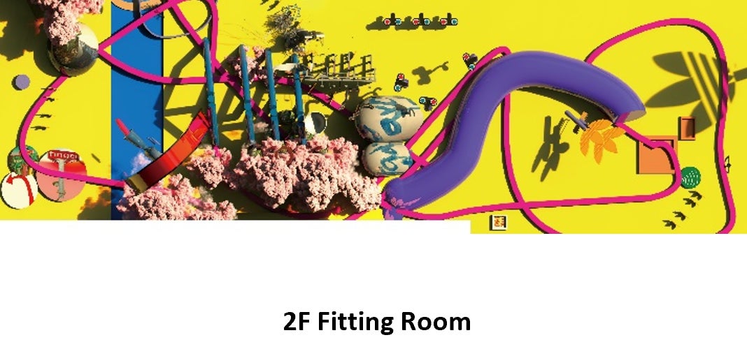藤倉氏は、adidas Originalsと原宿、両者の共通点はとてもスケールが大きな多様性と包括性であり、それはギリシャ時代より人々が集う交流点として機能してきた「広場」のようだと捉えました。たくさんの「広場」の集積が異なる文化の集まり、つまり世界と言えます。藤倉氏は「広場」としてのadidas Originalsが存在する原宿のパラレルワールドを3DCGで創造しました。ユニークな美学を以って構築されたその世界の、adidas Originals広場の景色がArchive Racksを彩り、超俯瞰の視点からの光景がFitting Areaのカーペットになっています