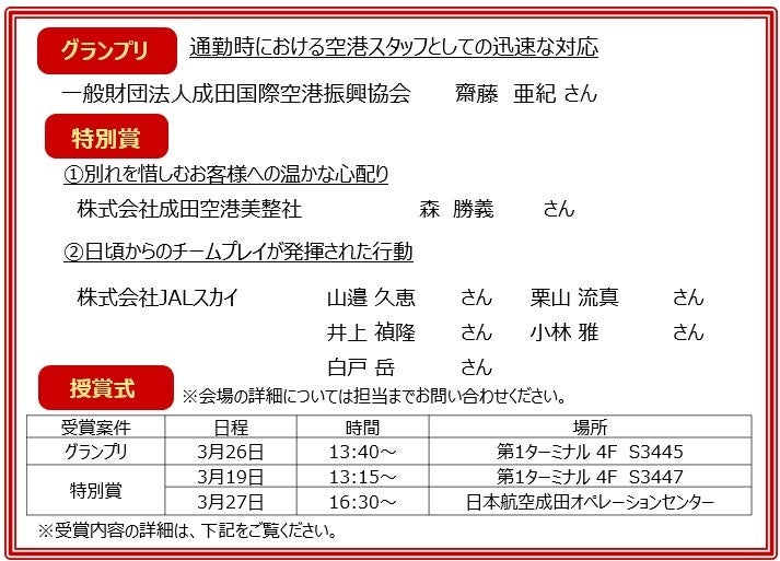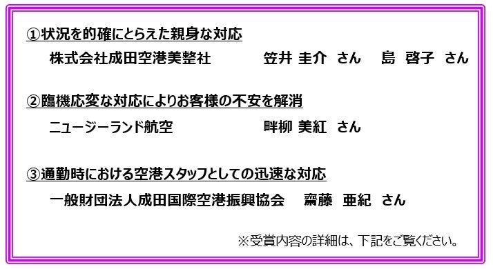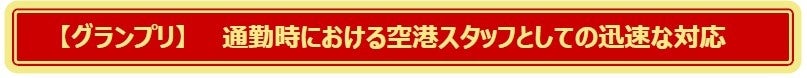 森さんの行動は、本来の業務を超えて、日頃から空港スタッフとしてお客様へのホスピタリティを意識している様子が窺え、お客様の笑顔を引き出すことに加え、成田空港スタッフのイメージ向上にも寄与したことが評価され、受賞に至りました。