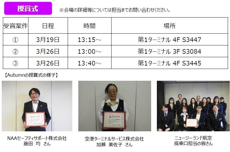 成田空港CS協議会※では、CS Award 2024 年間グランプリ及びCS Award 2024 Winterの受賞者を決定いたしました。受賞者を表彰するため授賞式を開催し、表彰状の授与、記念品の贈呈を行います。