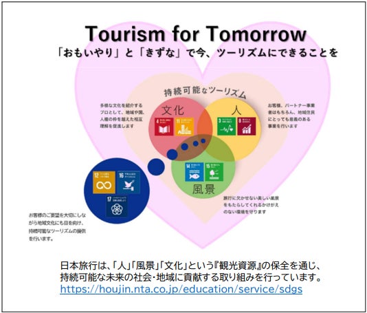 当社はSDGsの達成に貢献するとともに、企業理念の実践および企業ビジョンを実現するため、「人」「風景」「文化」をテーマにした取り組みを行っています。地域と協力し、カーボンオフセットに繋がる旅行商品の企画・販売やSDGsに取り組む企業との共創プログラムの展開、教材開発といった取り組みを進めています。