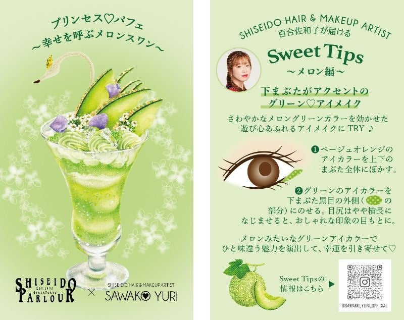 百合佐和子氏は“KAWAII”をテーマに愛らしい世界観を作り出す資生堂のヘアメイクアップアーティスト。百合氏と資生堂パーラーのコラボレーション企画第6弾では、メロンを主役にした特別なパフェをお届けします。果物言葉に「潤沢」「満足」という意味があるメロンを、幸福の象徴である白鳥をモチーフにしたデコレーションで仕立てました。特別な幸せ時間を提供する、きゅん♡とときめく、乙女心が動くパフェをどうぞお楽しみください。