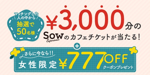 キャンペーン内容:期間内にマッチングした方の中から、抽選で50名様に、ソウ・エクスペリエンス株式会社の「カフェチケット 全国版*」をプレゼント