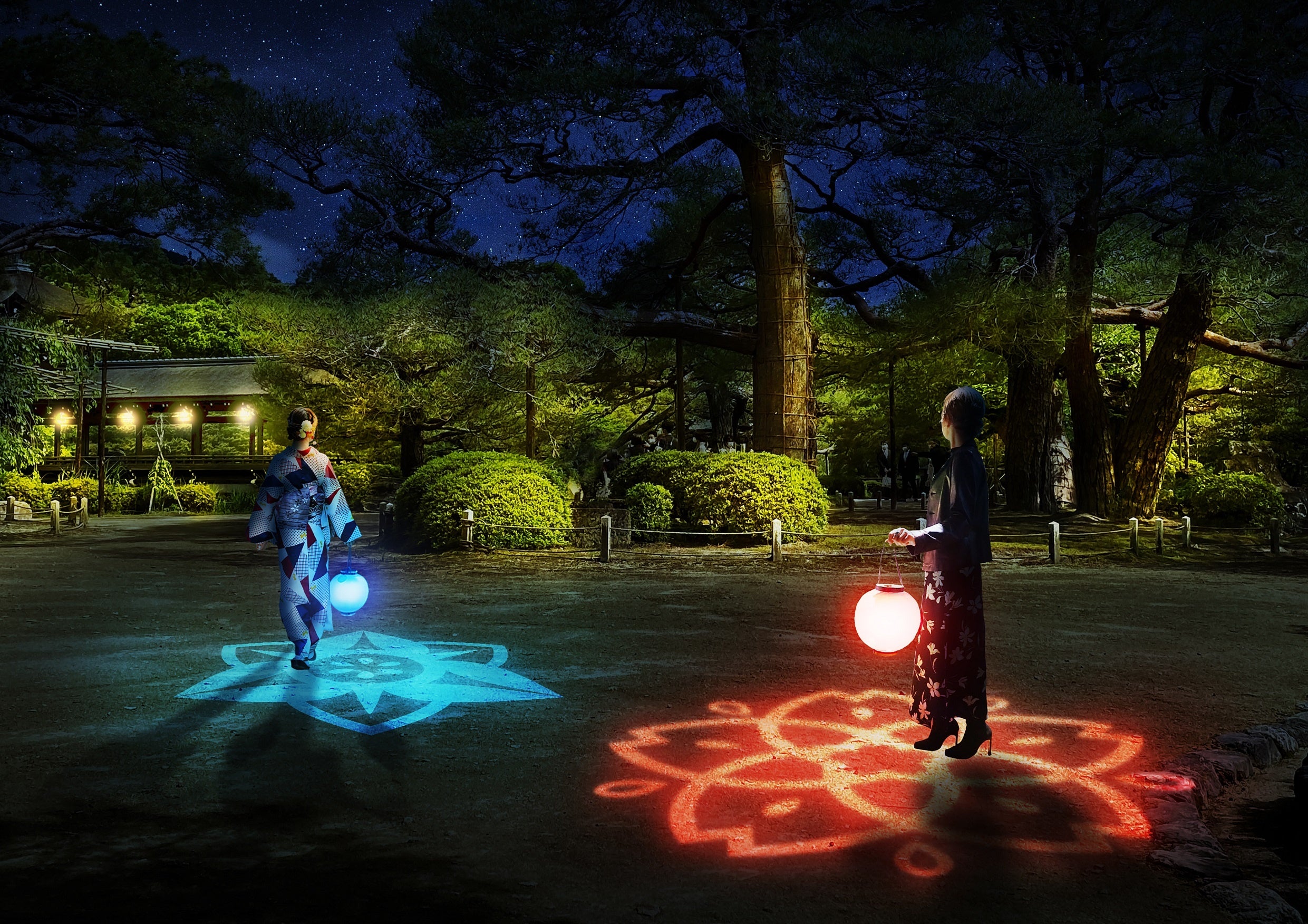 他にも境内や泰平閣では「NAKEDディスタンス提灯®︎」が連動するインタラクティブアートを展開。栖鳳池の西にたたずむ平安神宮の名勝・尚美館では、水面に反射する美しいプロジェクションマッピングショーをお届けします。