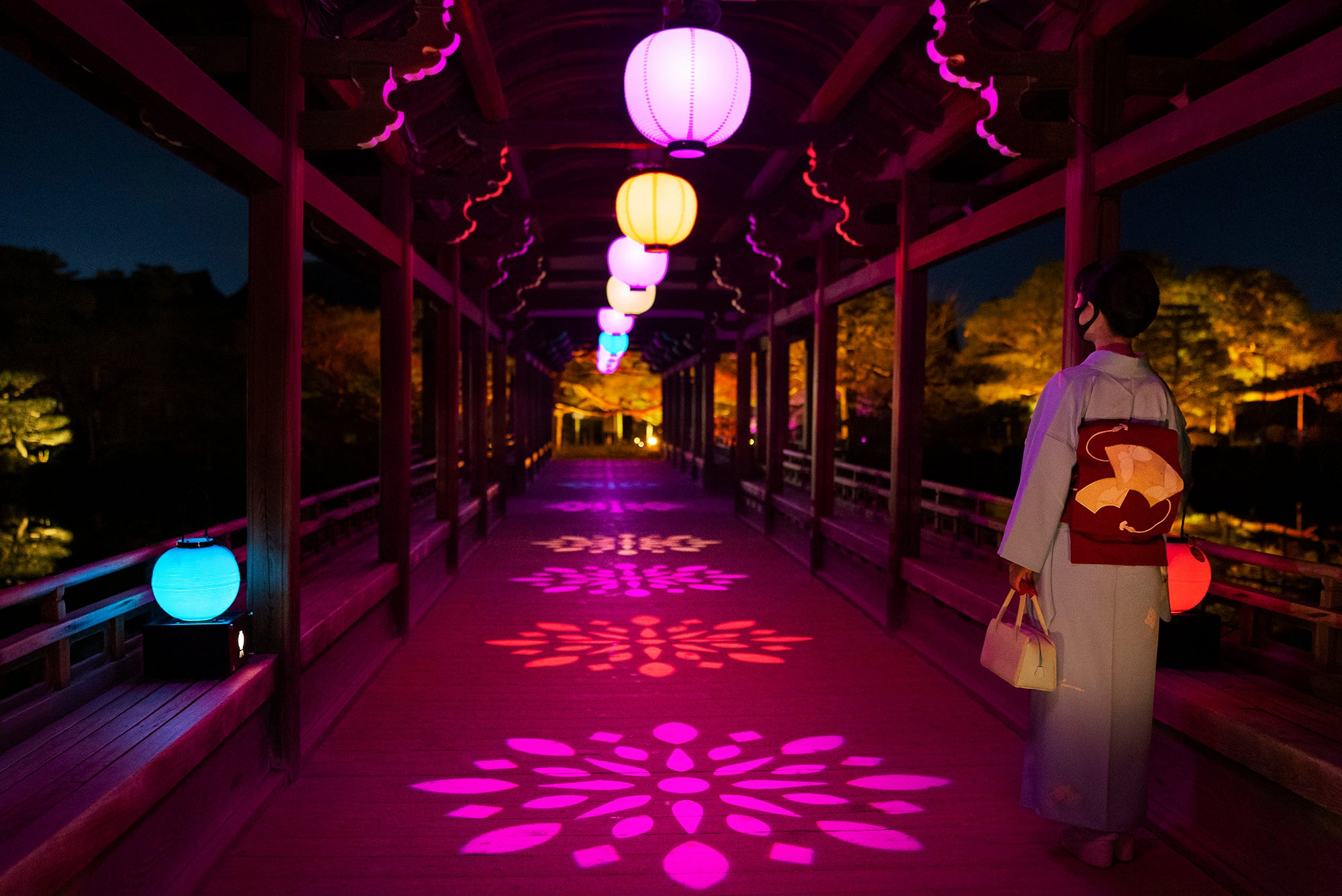 泰平閣が、提灯の灯りで照らし出され、光の回廊に変化。 NAKEDディスタンス提灯®を所定の場所に置くと、回廊の様相が変わるインタラクティブアート。