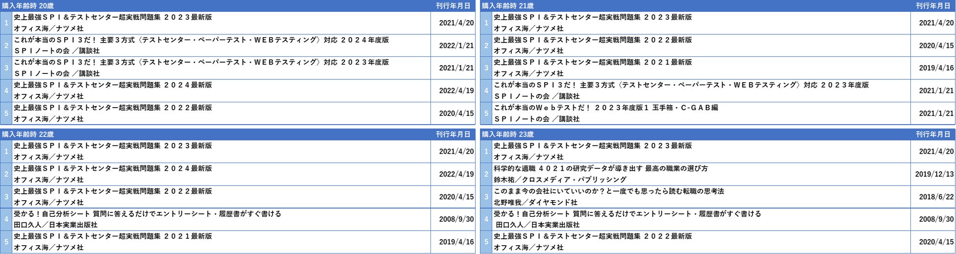 就職活動(新卒採用)期のボリュームゾーンではSPI、WEBテスト対策書籍が上位を占める。 - 23歳
