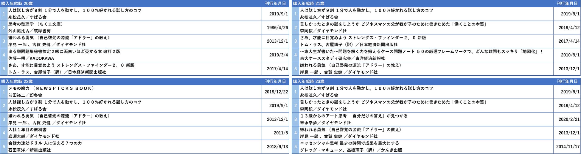 ジャンル「ビジネス実務・自己啓発」 20~30歳の各年齢別売れ筋タイトル (2019~2022年)
