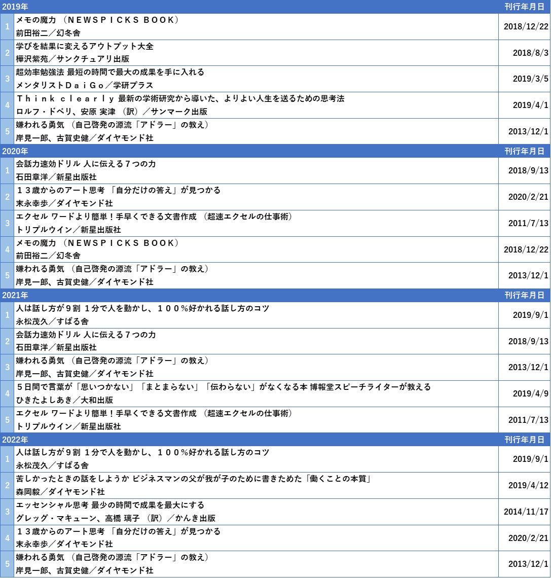 「ビジネス実務・自己啓発」はエントリーシートや面接で聞かれることもあるため、就活時のキーワードとも考えられます。2019年~2022年のhonto会員20~30歳の購入実績からみた売れ筋タイトルは比較的ロングセラーといえるタイトルが並びました。
