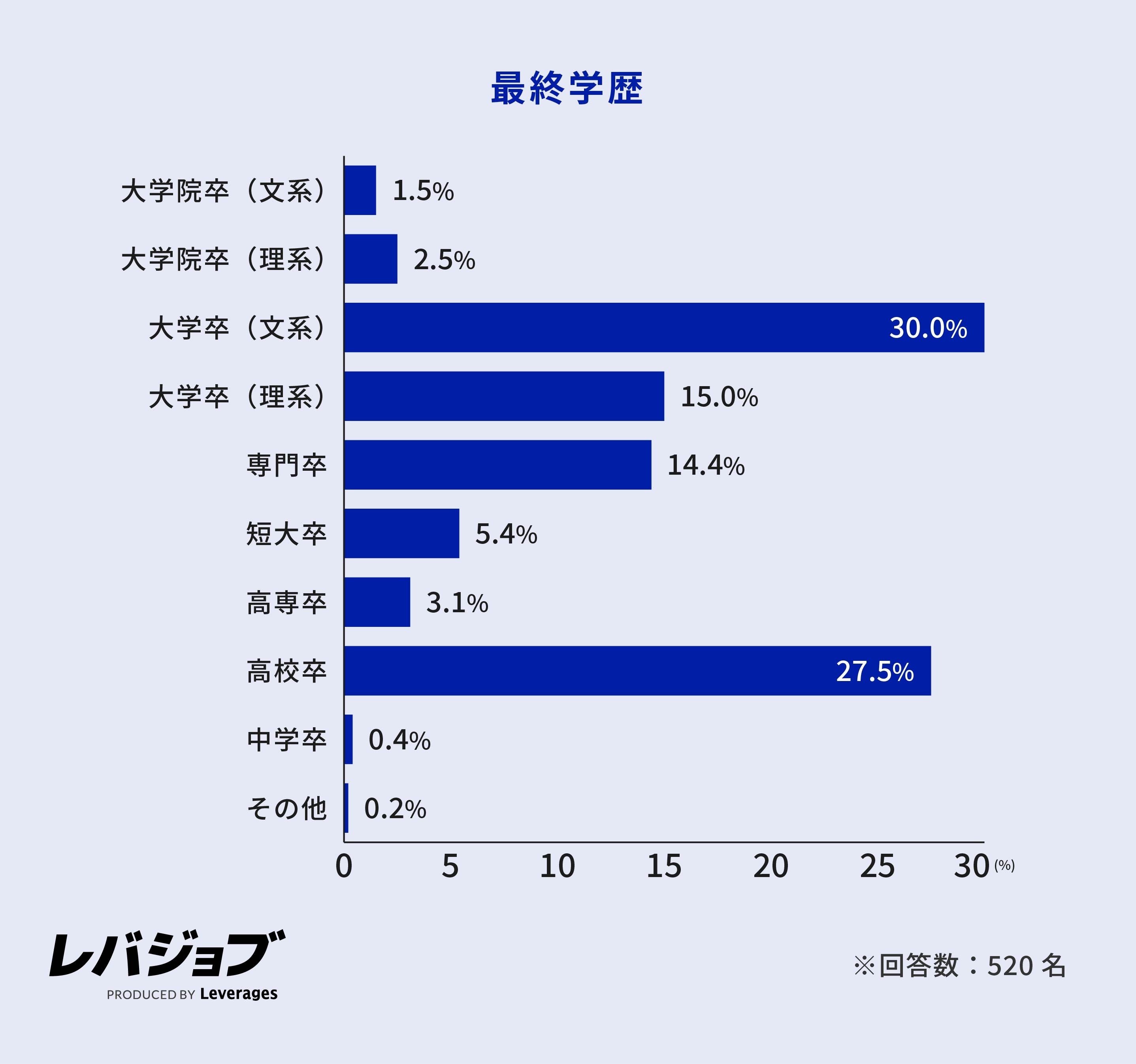 最終学歴は「文系大卒(30.0%)」が最多で、「高校卒(27.5%)」「理系大卒(15.0%)」が続き、幅広いバックグラウンドの人がブルーカラー職へ転向していることが分かります。