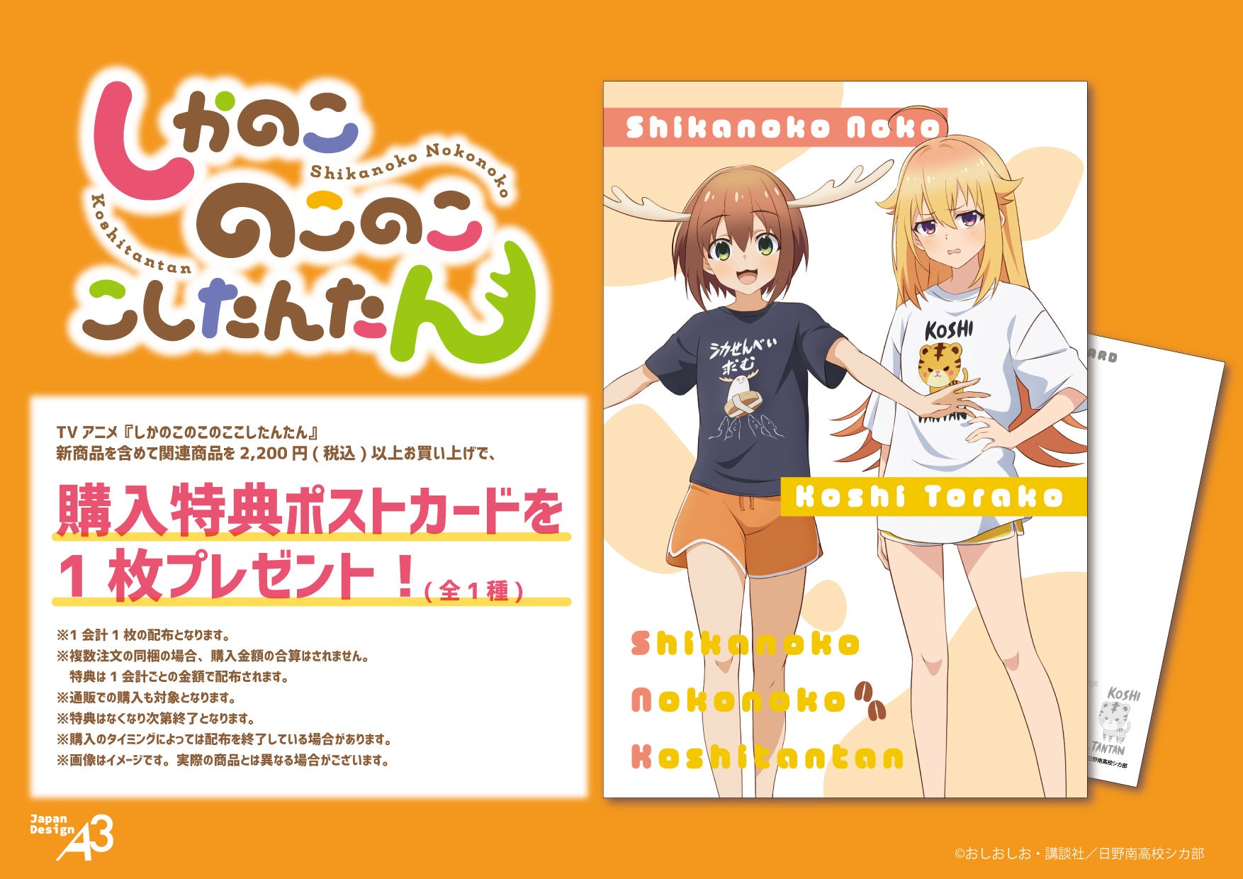 TVアニメ『しかのこのこのここしたんたん』の新作グッズを含む関連商品を1会計2,200円(税込)以上お買い上げで、ポストカードを1枚プレゼントします。