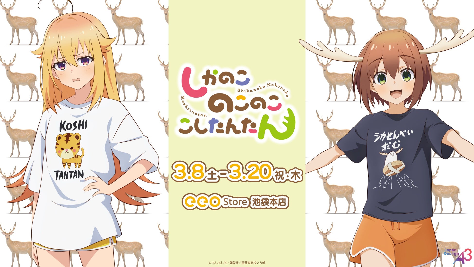 TVアニメ『しかのこのこのここしたんたん』の新作グッズが登場!3月20日(祝・木)までeeo Store池袋本店にて好評販売中です(通販サイト「eeo Store online」でもお取り扱い中)。