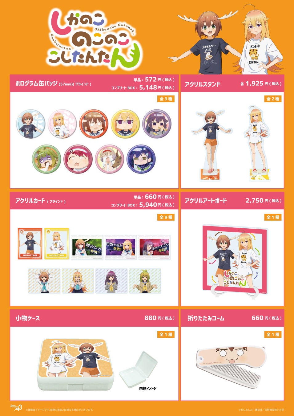 描き下ろし&公式イラストを使って、豪勢なラインナップで登場したTVアニメ『しかのこのこのここしたんたん』の新作グッズ。