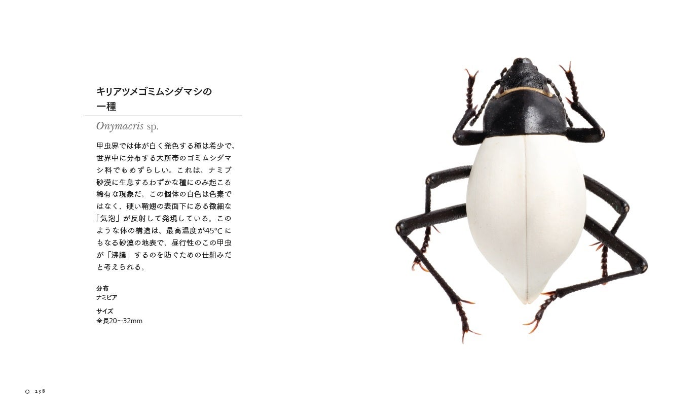 本書は、大英自然史博物館昆虫部門のキュレーターである著者たちが膨大な昆虫標本コレクションのなかから特別にセレクトした126種を、色別に分類し、美しい写真で紹介する一冊です。