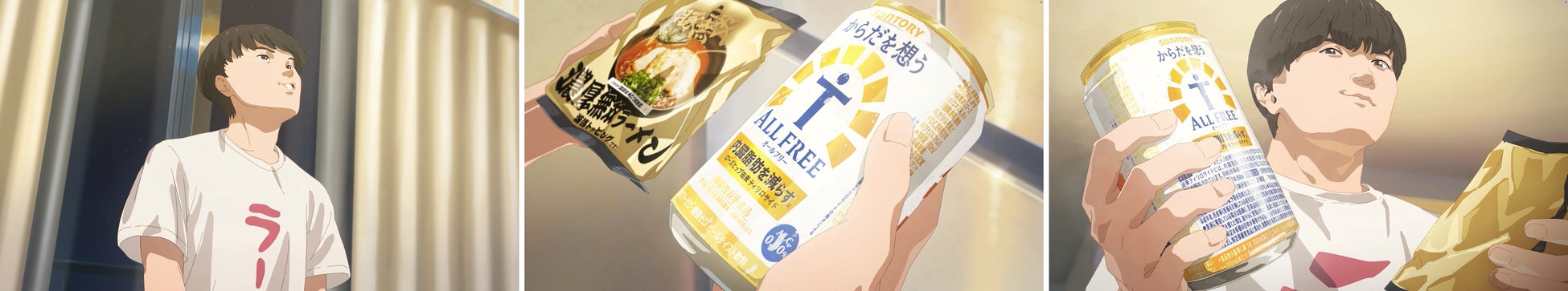 本CMは、夜中にふと見かけたラーメンの画像に心を奪われた人気YouTuber・SUSURUさんが、ラーメンと「からだを想うオールフリー」を堪能する様子を描いたアニメです。背徳感の象徴である「深夜ラーメン」に誘惑されたSUSURUさんが、「からだを想うオールフリー」と共に、気兼ねなくラーメンを楽しむ。そんな前向きな選択と、それを後押しする「からだを想うオールフリー」があるからこそ実現する、食の喜びを描きました。