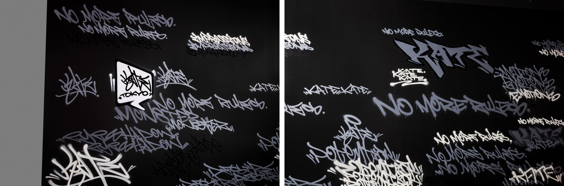 日本グラフィティ界のパイオニアでありながら、枠に囚われず、あらゆる分野でマルチな才能を発揮するアーティストKAZZ ROCK(カズロック)さんが、渋谷のストリート感あるグラフィックをKATEのブランドスローガン「NO MORE RULES.」をテーマに演出。新たな出会いを後押しする躍動感溢れるグラフィックは、レジ裏の壁面にデザインされています。
