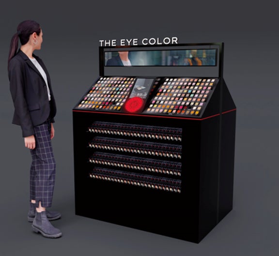AIとKATE独自ロジックの顔印象分析により、パーソナライズされた4色のアイカラーが自動販売機のように出てくるデジタルコンテンツ「KATE iCON BOX」を試せるのは、この店舗だけ!