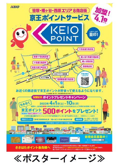 京王電鉄株式会社(本社:東京都多摩市、取締役社長:都村 智史)、株式会社京王パスポートクラブ(本社:東京都渋谷区、取締役社長:安永 克彦)と渋谷区 西原・幡ヶ谷・笹塚商店街連合会(以下「ささはた商店街」)は、お客様の利便性向上および沿線エリア活性化による沿線価値向上を目的に、2023年4月1日(土)より西原・幡ヶ谷・笹塚エリアの8つの商店街に京王電鉄が運営する「京王ポイントサービス」(以下、「本サービス」)を導入します。まずは26店舗が加盟し、対象店舗は順次拡大予定です。また、今回新たにポイント加盟となった店舗を対象にポイントプレゼントキャンペーンを4月1日(土)~10日(月)まで開催します。