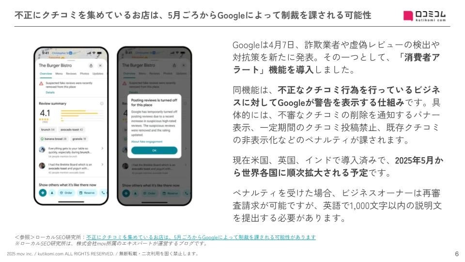 不正なクチコミ行為を行っているビジネスにペナルティ、「消費者アラート」ほか:最新の「Googleマップ・MEO」情報レポート【2025年4月版】を口コミコムが公開