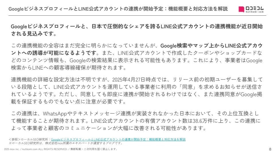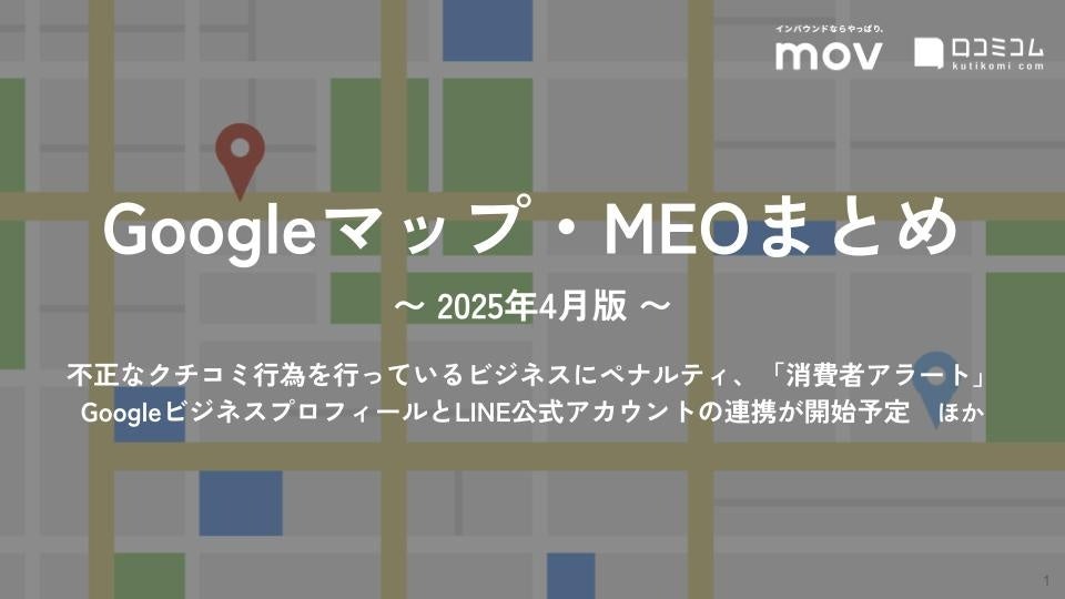 店舗向け集客一元化プラットフォーム「口コミコム」および業界最大級のインバウンドビジネスメディア「訪日ラボ」を運営する株式会社mov(代表取締役:渡邊 誠、本社:東京都渋谷区、以下mov)は、Googleマップ・Googleビジネスプロフィール(旧Googleマイビジネス)の更新情報や、口コミマーケティングノウハウなどの最新ニュースをまとめた「Googleマップ・MEOまとめ【2025年4月版】」を公開しました。