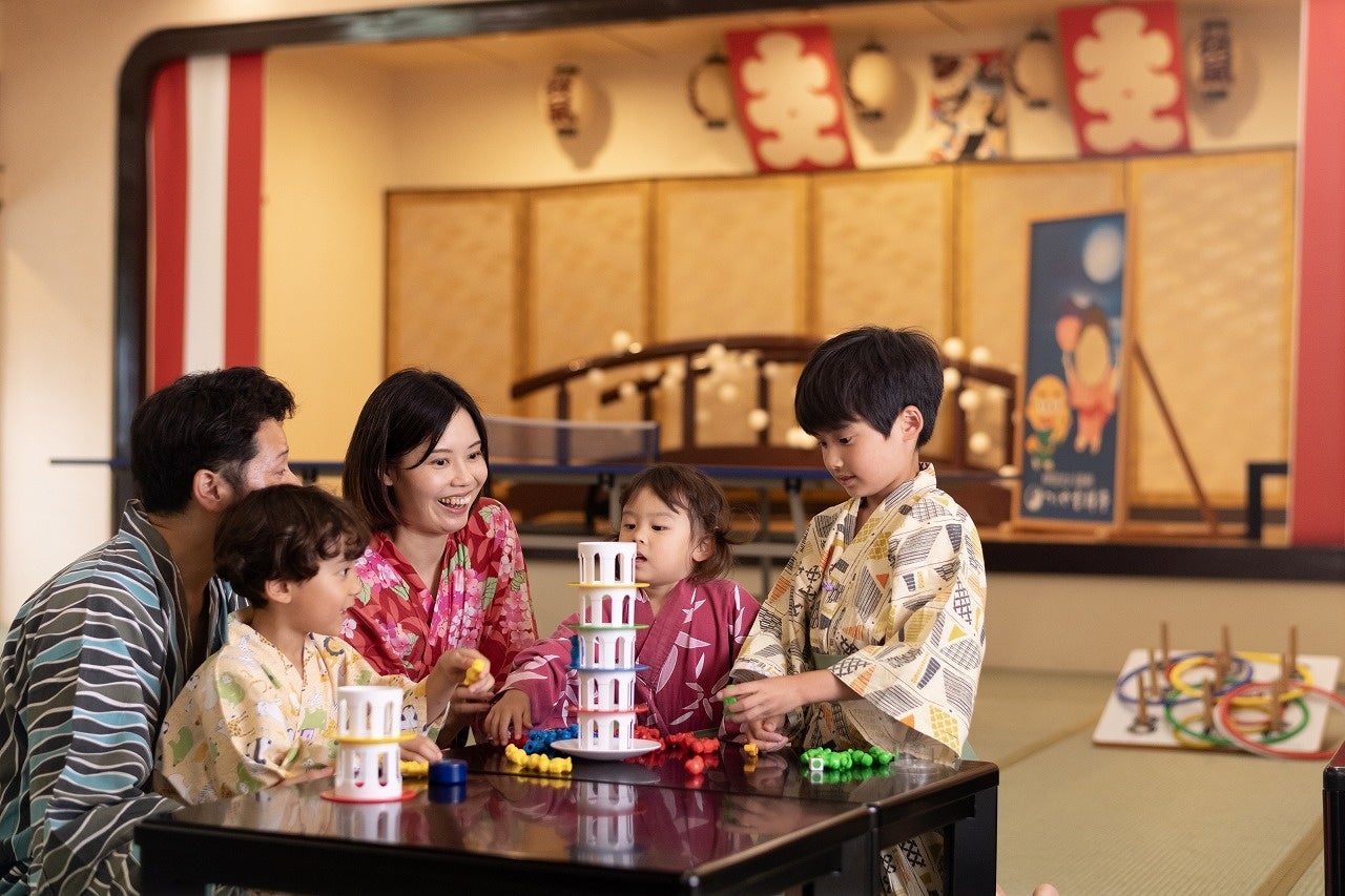 アミューズメントスペースの温泉卓球やレトロなゲームで盛り上がった後は、家族で一緒に入浴できる貸切風呂でさっぱりと。小学生以下のお子さまには、キッズアメニティセットもプレゼント。何が入っているかはお楽しみ。