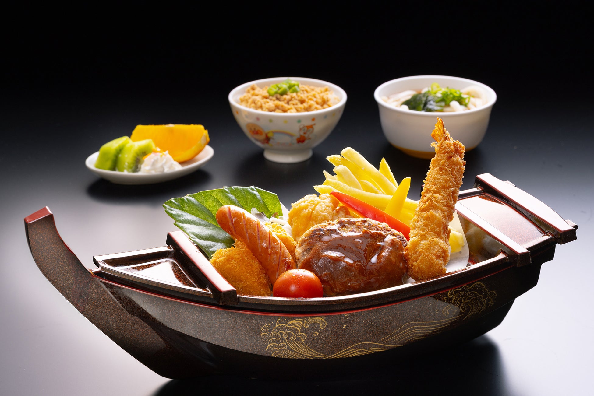 エビフライ、ハンバーグ、ポテトフライ、ソーセージ、そぼろごはん、ミニうどん、デザート