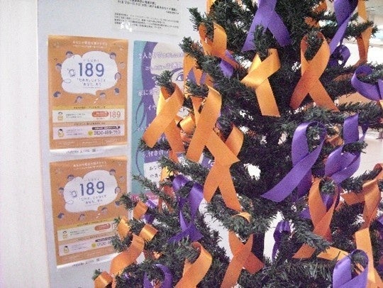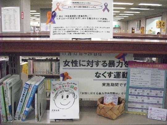 11月中は市役所東館1階に、オレンジリボンとパープルリボンのダブルリボンツリーを飾ります。中央図書館では、DVや児童虐待に関連する図書を集約して展示します。