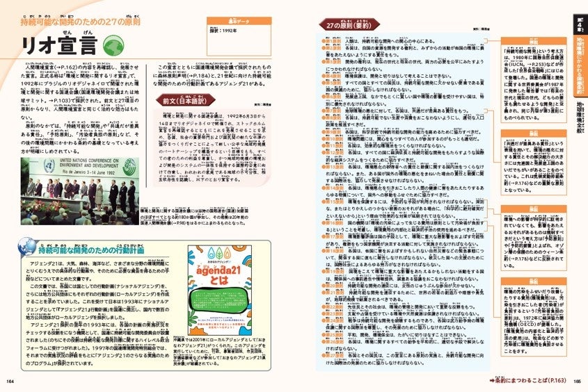 ▲3巻第4章「地球環境にかかわる国際条約」より。1992年に採択されたリオ宣言の「持続可能な開発のための27の原則」は、地球環境問題にかかわる考え方の基礎となった。