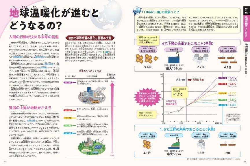 ▲1巻第1章より。さまざまな気象データから研究者らがはじきだした、「地球温暖化が進んだ未来」に何が起きるかのシミュレーション。なぜ地球温暖化を防がなければならないかがよくわかる。