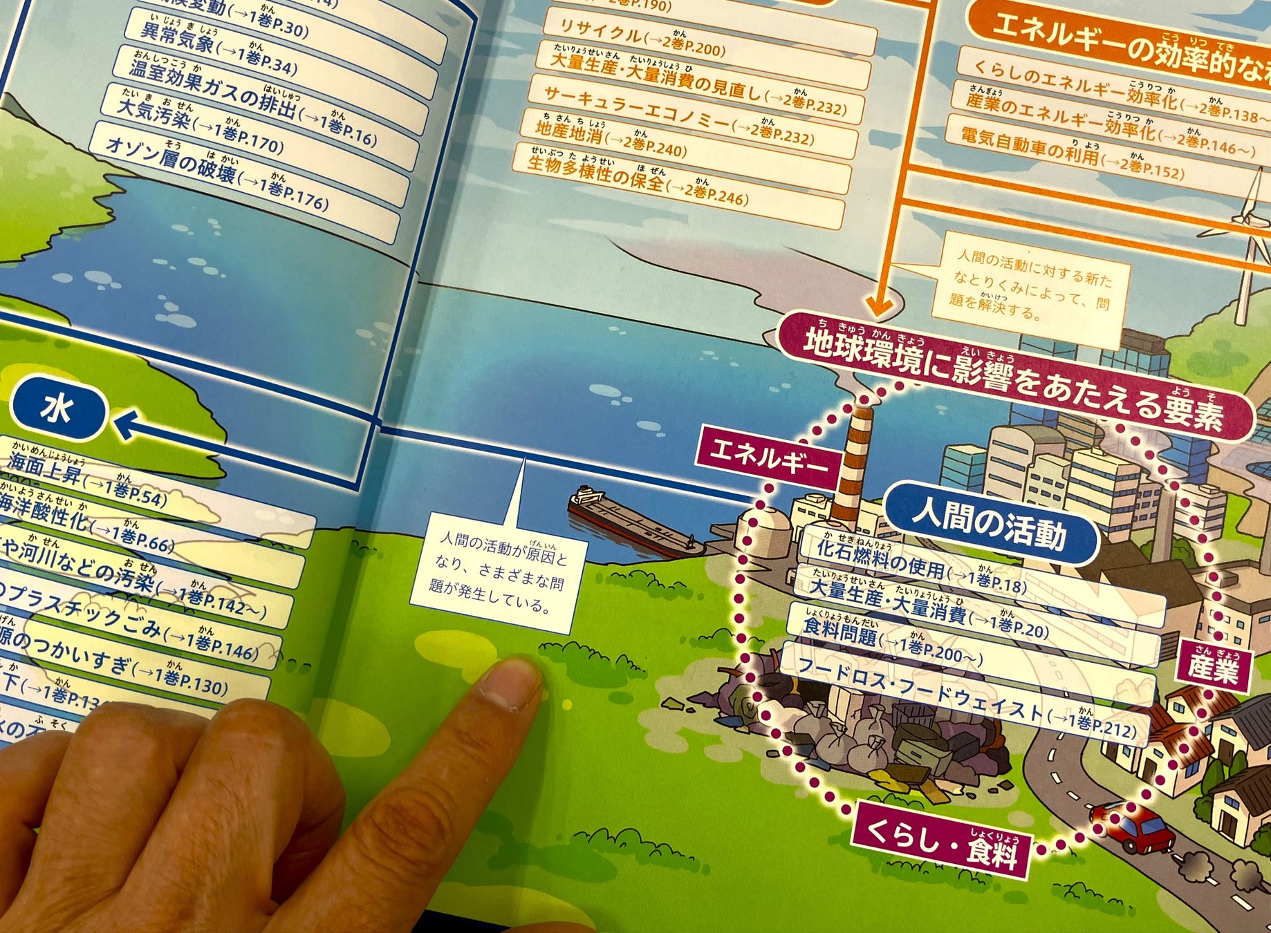 3巻「学習資料集・索引」では、総索引とともに、地球の環境・気象等のデータ、絶滅が危惧される生物図鑑、環境問題の歴史やよく耳にする環境用語、環境にかかわる国際条約や法律、組織などを紹介し、環境について興味を持った子どもたちが(大人たちも)より理解を深められます。