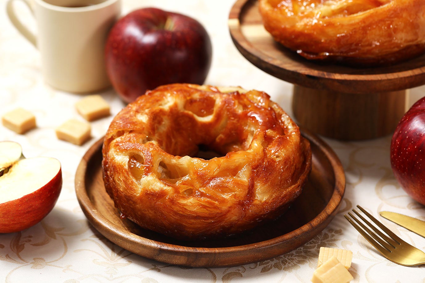 こだわり:デニッシュ生地にごろっと果肉感のあるりんごを巻き込んで焼き上げ、表面をキャラメリゼしてクイニーアマン風に仕上げました。甘酸っぱいりんごとキャラメリゼのパリパリ感や香ばしさがやみつきな冬の”季節のリング”。多くのお客様に味わっていただきたい思いより、従来の季節のリングよりお求めやすい価格でお楽しみいただけます。