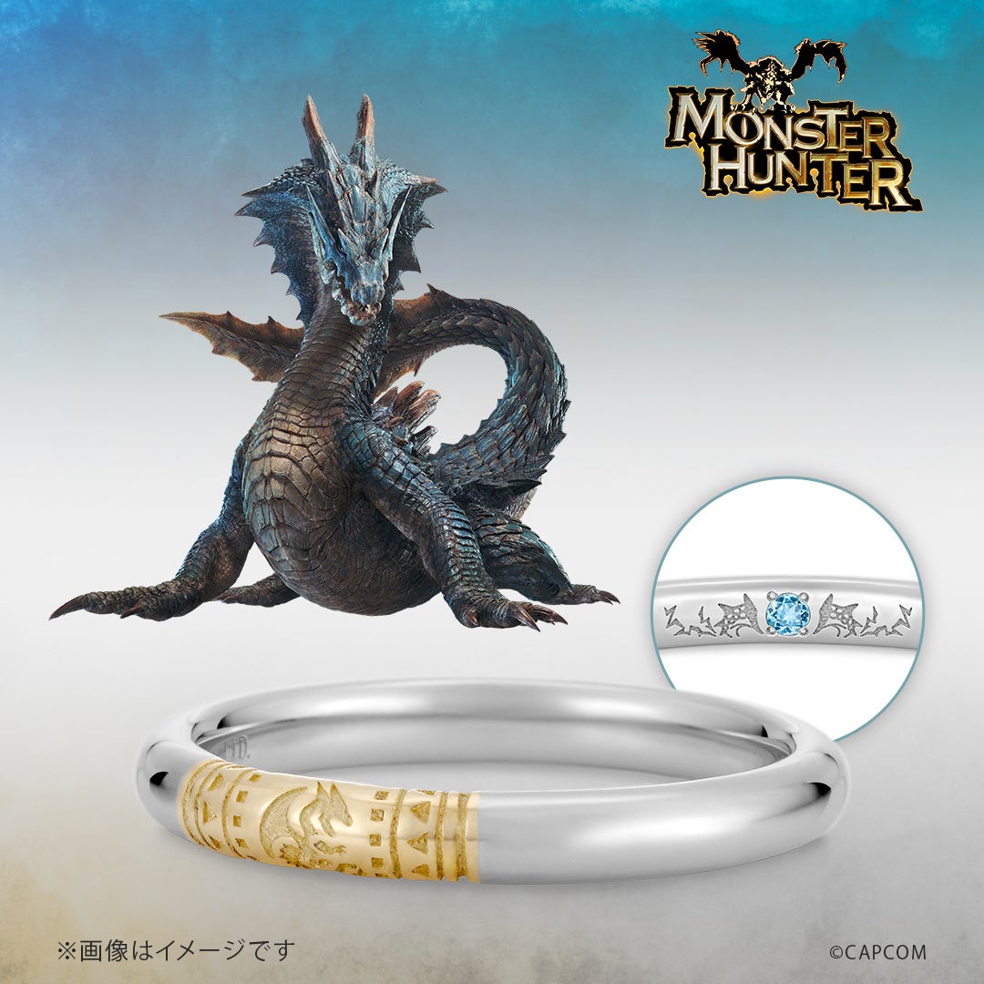 このたびの新作は、内側にモンスターを象った刻印をデザインしたリング(指輪)です。「アルシュベルド」モデルにダイヤモンドを、「ラギアクルス」モデルにはブルートパーズをあしらいました。素材は全5種類ご用意しており、結婚指輪、ペアリング、ファッションリングとしてもお使いいただけます。