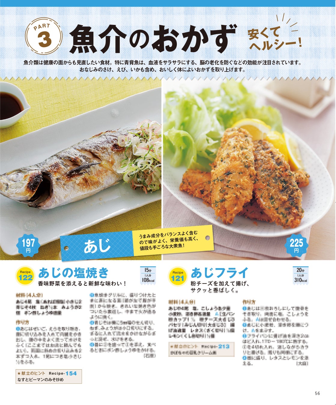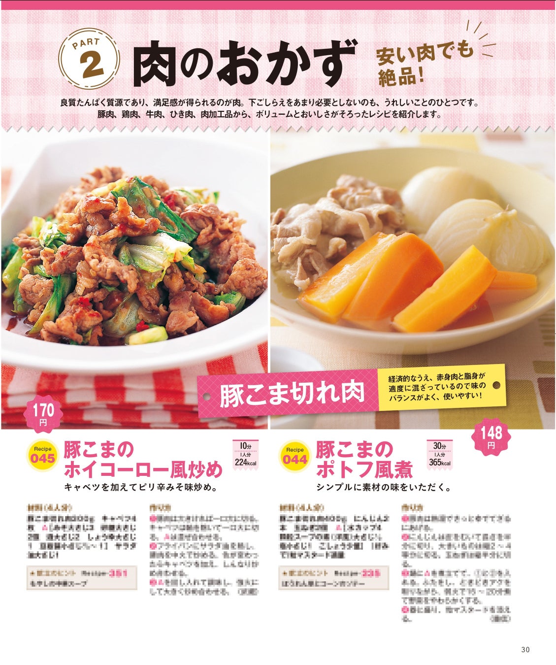 パート2からは、肉のおかず、魚介のおかず、野菜のおかず、卵・豆腐のおかず、と素材別に節約おかずを紹介しています。パートの中は、豚こま切れ肉・豚薄切り肉etc.材料別になっているので、冷蔵庫にある材料を使いたいときにレシピを探すのも便利。