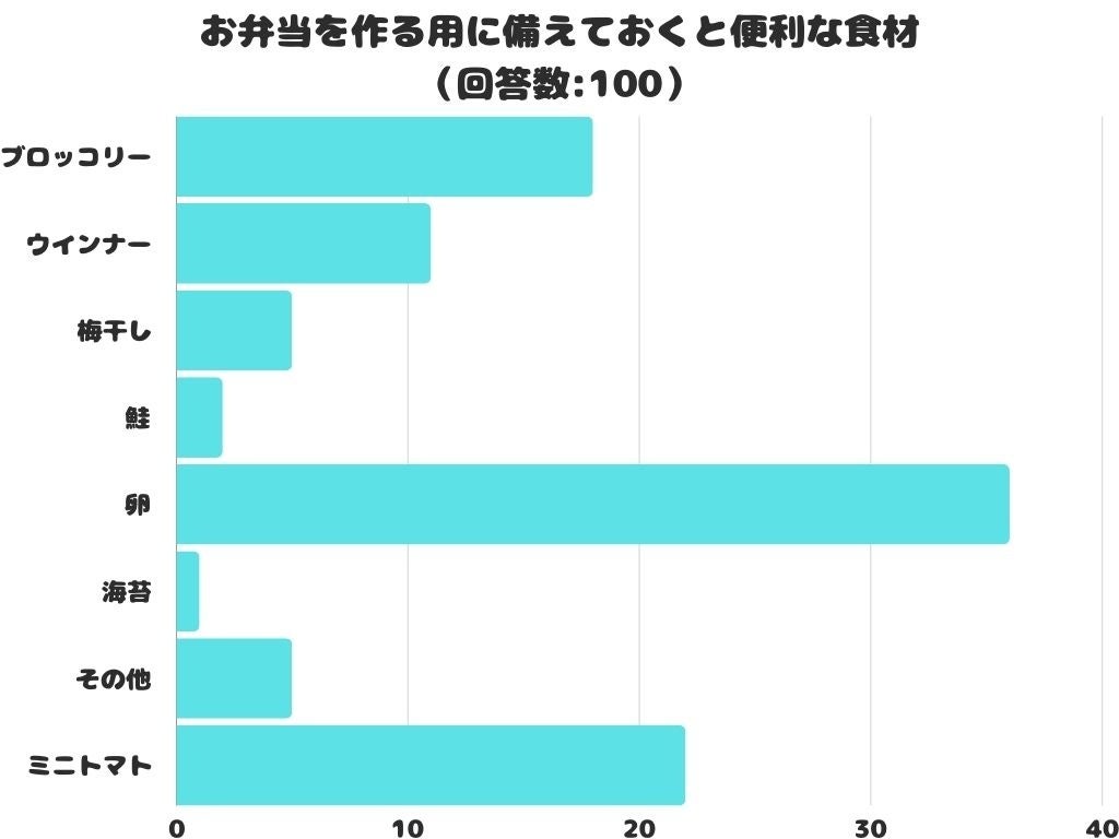 お弁当を作る用に備えておくと便利な食材をアンケートにて調査したところ、1位は「卵」でした。