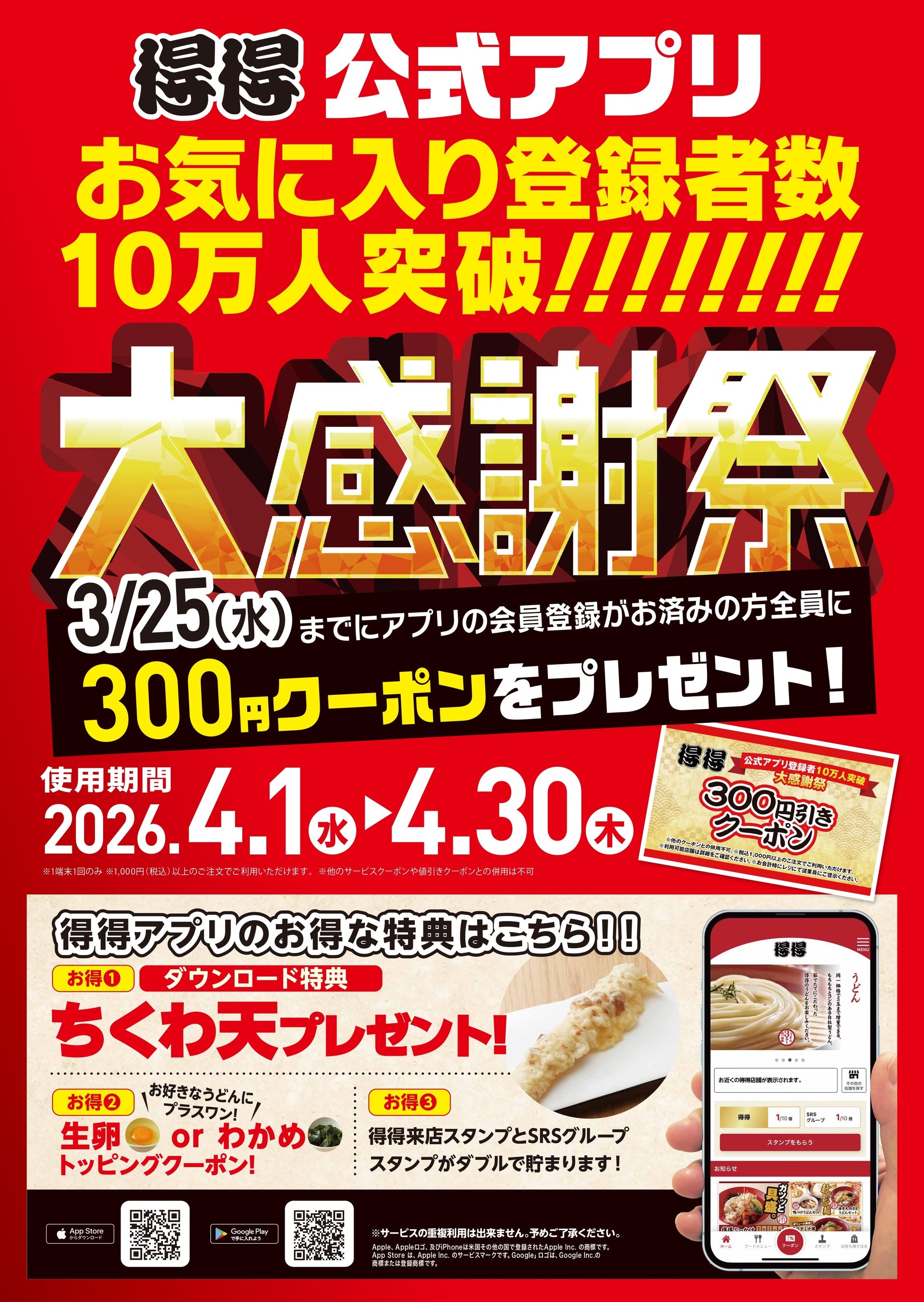 このたび「得得公式アプリ」において、アプリ会員登録者数が10万人を突破いたしました。日頃のご愛顧への感謝の気持ちを込めて、対象会員様へ300円引きクーポンをプレゼントする記念キャンペーンを実施いたします。既存会員様はもちろん、期間内に新規でご登録いただいた方も対象となり、より多くのお客様にお得にご利用いただける内容となっております。