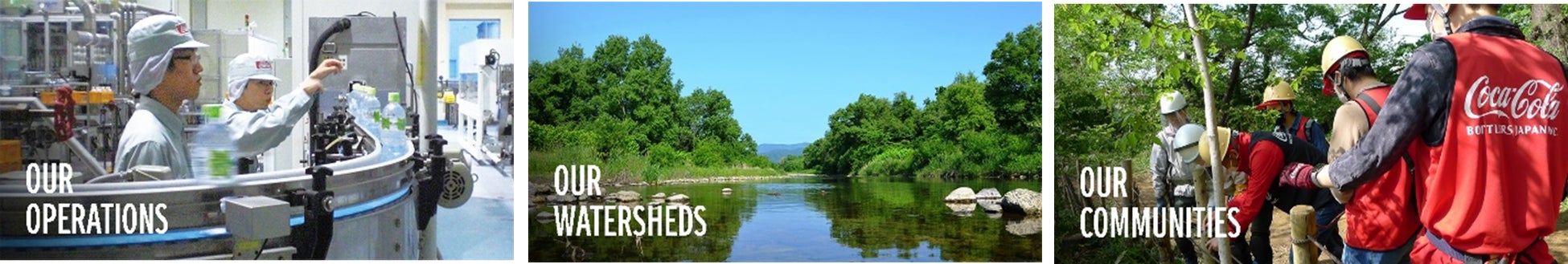 ザ コカ・コーラ カンパニーは2021年3月、2030年に向けた水資源保全戦略のグローバルフレームワーク(「2030年水資源保全戦略」)を発表しました。本戦略の下、世界各国・地域において「OUR OPERATIONS(工場の運営)」「OUR WATERSHEDS(流域)」「OUR COMMUNITIES(地域社会)」の三つの柱に基づく活動を進めています。また2023年3月には、この戦略で重点的に取り組む主な領域に関連したグローバル目標の詳細を公表しています。