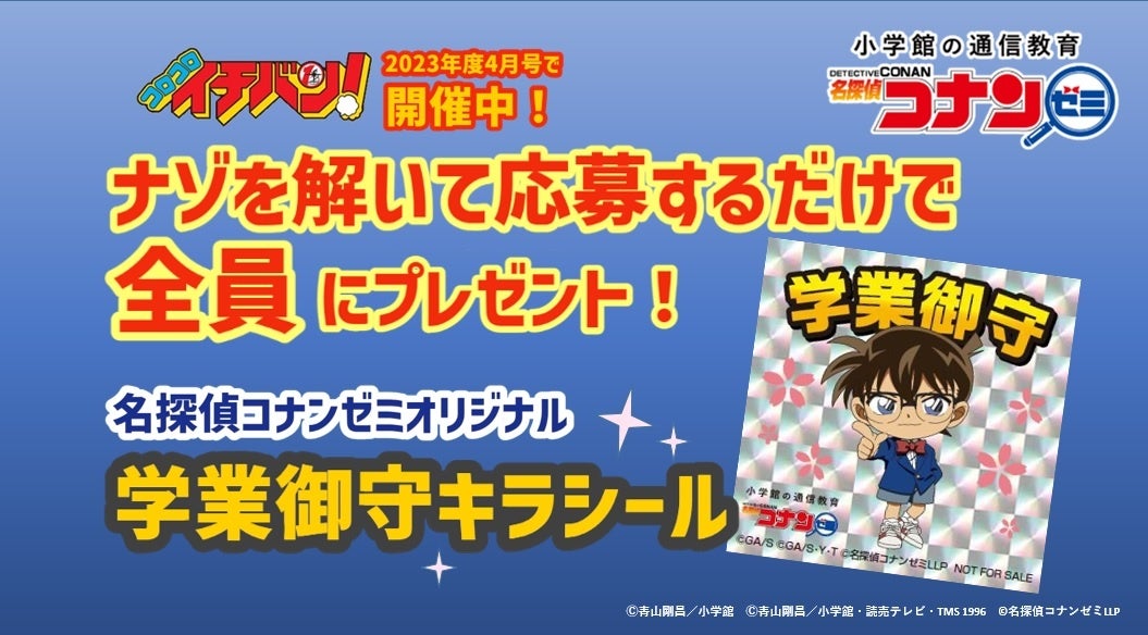 株式会社小学館集英社プロダクションが運営する「小学館の通信教育 名探偵コナンゼミ」では、この春進級する小学生の学習応援として、ナゾトキの答えを書いて応募した方全員にオリジナル「学業御守キラシール」プレゼントする企画を、現在発売中の小学館のコミック誌『コロコロイチバン!』4月号内にて開催。本誌に付属のはがきまたは二次元コードからナゾの答えを書いて応募しよう!