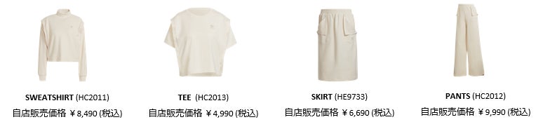 プラスチックゴミ ゼロの未来へ向けたアパレルも登場いたします。アイコニックなデザインを踏襲しながら、Parley Ocean Plastic糸を含むリサイクル素材を100%使用したクラシックな「FIREBIRD」トラックスーツをはじめ、スリーストライプスが特徴でParley Ocean Plasticを50%使用した糸で作られた「TRACE TEE」「3 STRIPES TEE」がラインナップされています。また、生産工程における水の消費量を減らすために、染料を使わず、素材の自然な色を生かした「CC HOODY」「CC TEE」「SKIRT」「PANTS」などが登場いたします。さらに、無染色のオーガニックコットンを100%使用した「SWEATSHIRT」はリブ仕上げのモックネックと袖口がアクセントに。「TEE」も同素材でリブ仕上げのクルーネックのデザインが採用されており、地球に優しい素材を使用しながらも、スタイルを妥協しないアパレルが数多く揃っています。
