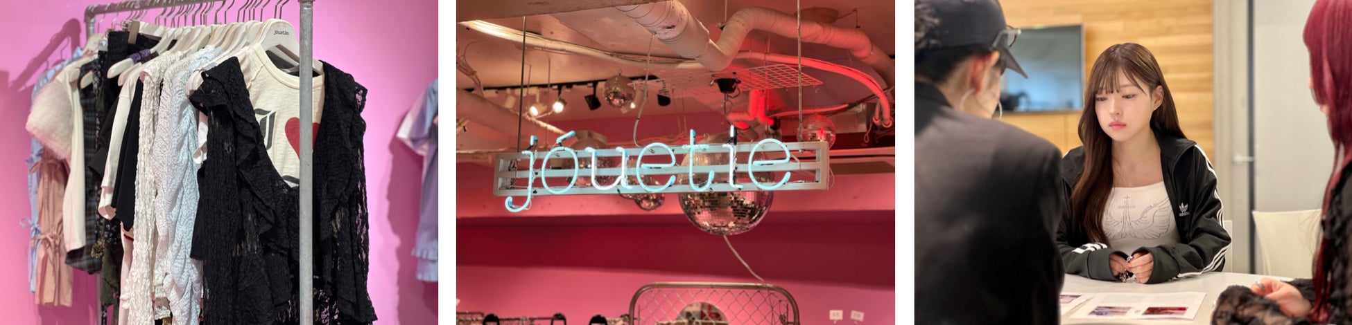ファッションが大好きだというMINAMIは、時折悩みながらも終始楽しそうにコーディネートを提案し、その驚きのスピードと抜群のセンスには、思わず栗岡沙樹さん、黒越真梨さんからも「私たちが普段思い付かないような、MINAMIさんとのコラボレーションならではの、jouetieの新たな一面が見えた。」と笑みが(写真、左)。最終的にどんなコーディネートに仕上がったのか、ここから先は当日をお楽しみに♡