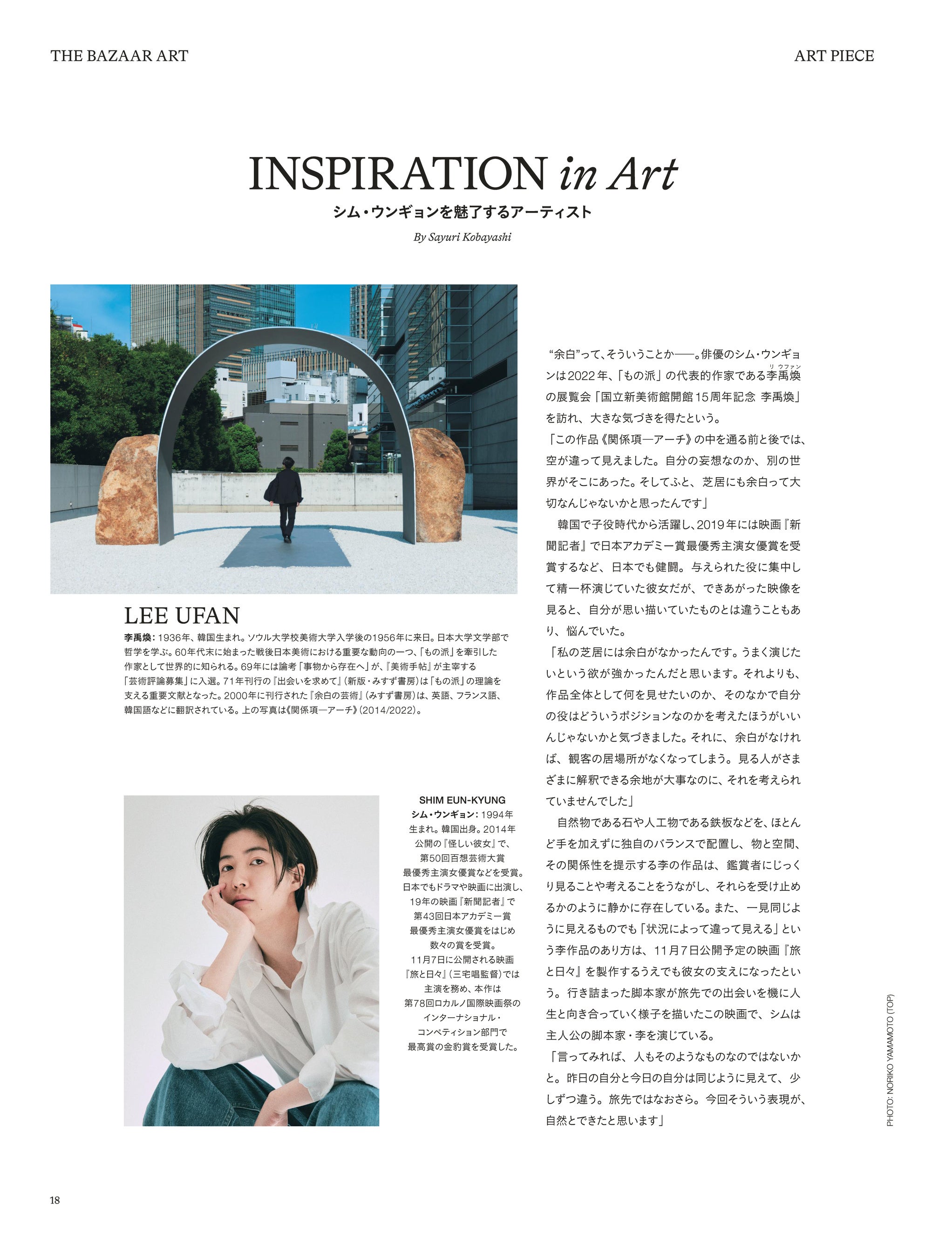 韓国で子役時代から活躍し、2019年には映画『新聞記者』で日本アカデミー賞最優秀主演女優賞を受賞した実力派俳優シム・ウンギョンが、影響を受けたアーティストについて語る特別インタビューをお届けします。「もの派」を代表する作家・李禹煥の展覧会「国立新美術館開館15周年記念 李禹煥」を訪れた経験を振り返り、芝居における“余白”への気づきや、11月7日公開予定の主演映画『旅と日々』への思いを語っています。