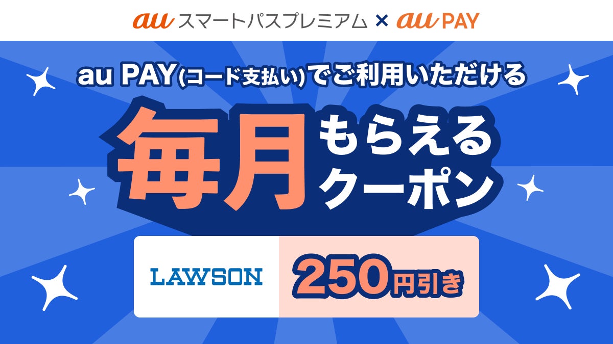 auスマートパスプレミアムは、日常生活でのお買い物や、映画などのエンタメにお使いいただけるおトクなクーポンをはじめ、スマートフォンをもっと快適かつ楽しくお使いいただくためのデジタルコンテンツや安心をお客さまに提供するサービスです。この度、au PAY(コード支払い)でご利用いただける「毎月もらえるクーポン」として、本日以降毎月1日に、ローソンで251円以上のお買い物に使える250円割引クーポンの提供をスタートします。